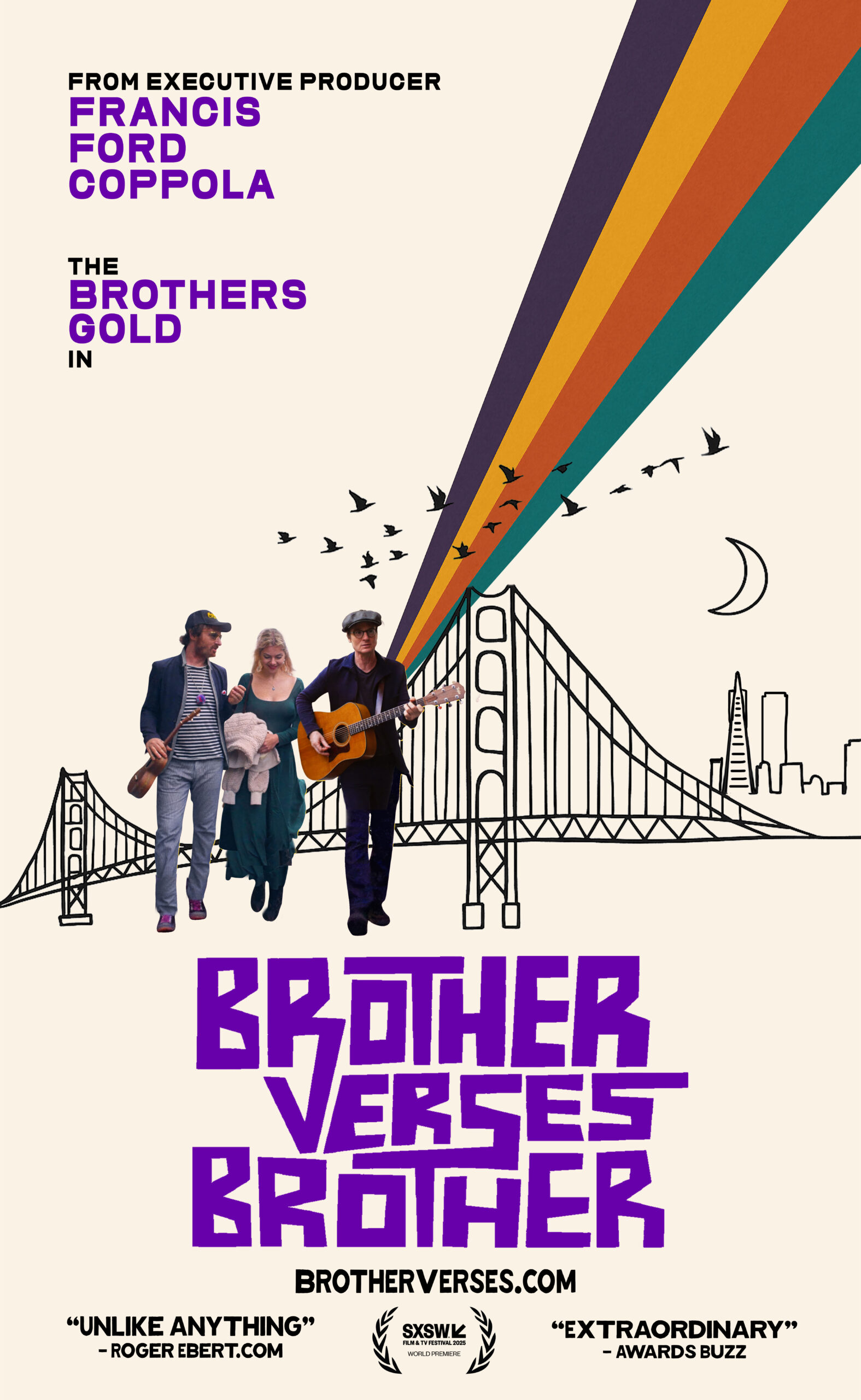 Inspirada en el concepto de “Cine en Vivo” de Francis Coppola, Brother Verses Brother es una odisea musical radicalmente personal. Dos hermanos gemelos músicos —combativos pero unidos— recorren las calles de San Francisco en una sola toma continua, buscando a su padre poeta moribundo. Uno busca amor y emoción, mientras el otro intenta desaparecer en su música. Interpretada por la propia familia del director en una improvisación, la película los lleva desde los refugios secretos de los poetas de la Generación Beat hasta el corazón de su familia. A medida que cae la noche y su padre sigue desaparecido, su búsqueda frenética se convierte en un testimonio del poder de la música, la fraternidad y el alma de una ciudad, experimentado por el espectador en tiempo real. Co-protagoniza Herbert Gold, el legendario novelista y último poeta Beat vivo a sus 99 años, quien falleció semanas después de filmar su papel.